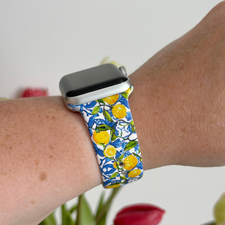 Brighten up your Apple Watch with the Amalfi Lemon Apple Watch Strap. Inspired by the vibrant charm of the Amalfi Coast, this strap features a refreshing lemon pattern that adds a touch of sunshine to your wrist, perfect for those who love a burst of colour and style.