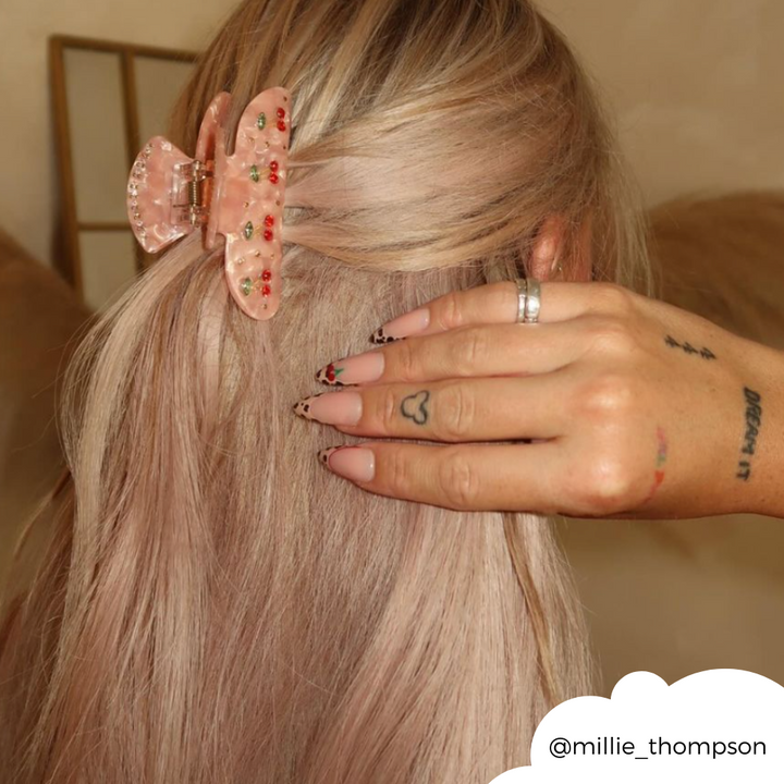 Whether you're rocking a sleek up-do, a casual half-up style, or simply clipping back your hair on the go, the Pink Pearl Cherries Claw Clip is the perfect accessory to complete your look. Its versatile design complements a wide range of hairstyles and outfits, making it a must-have addition to your hair accessory collection.