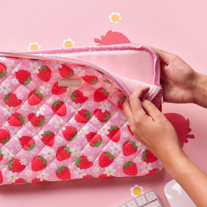 Add a pop of colour and personality to your laptop with our Quilted Berry Cute Strawberry Laptop Sleeve. Protect your device in style and make a statement wherever you go. Say goodbye to boring plain sleeves and hello to playful fashion!