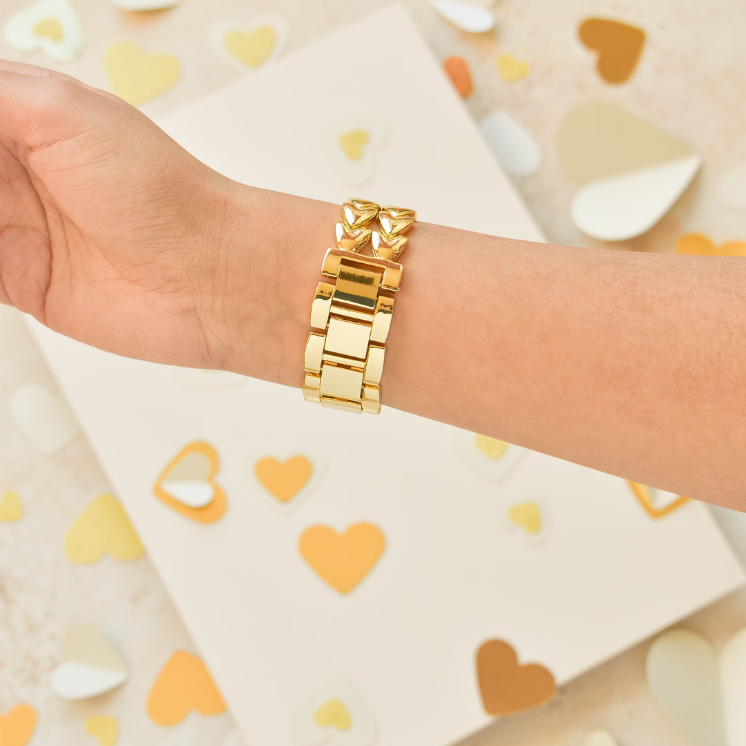 Close-up of a person wearing a gold smartwatch with the Coconut Lane Hearts Chain Apple Watch Strap - Gold. The background is adorned with various gold and cream-colored heart shapes. The person's hand is resting on what appears to be another arm or hand, elegantly showcasing the watch.