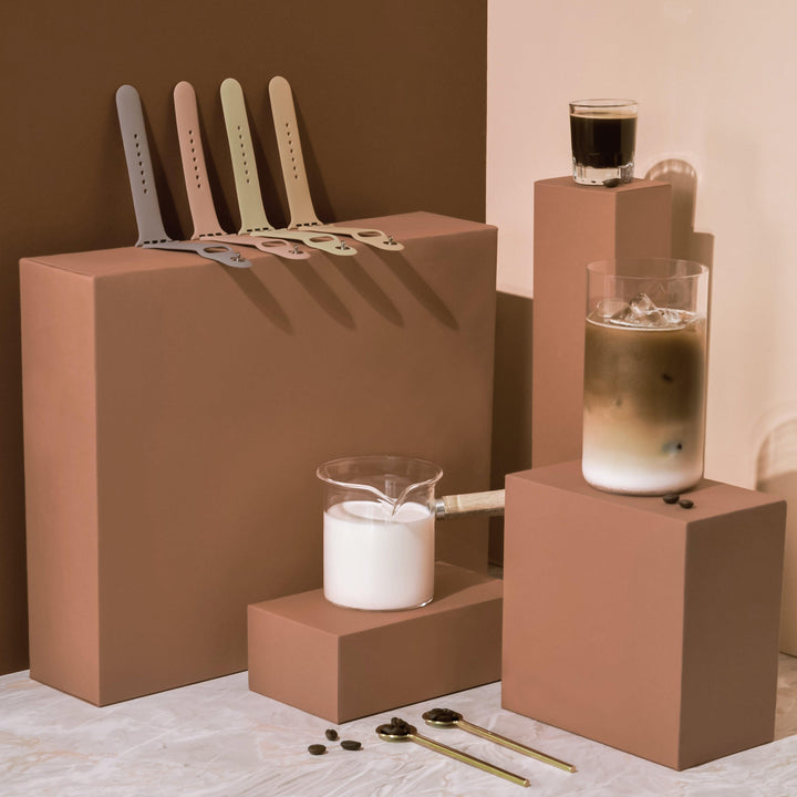 A minimalistic composition from the NAKD Collection featuring three brown boxes of varying heights. Displayed are four colored Coconut Lane Apple Watch Straps in Cappuccino, a small beaker of milk, a glass of iced coffee on a glass block, and a shorter glass of espresso. Two golden spoons and coffee beans adorn the marble surface.