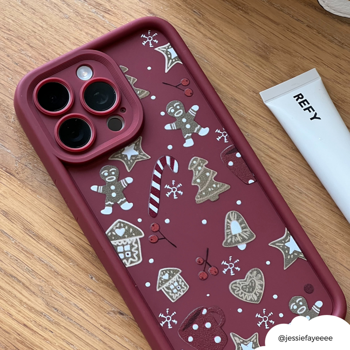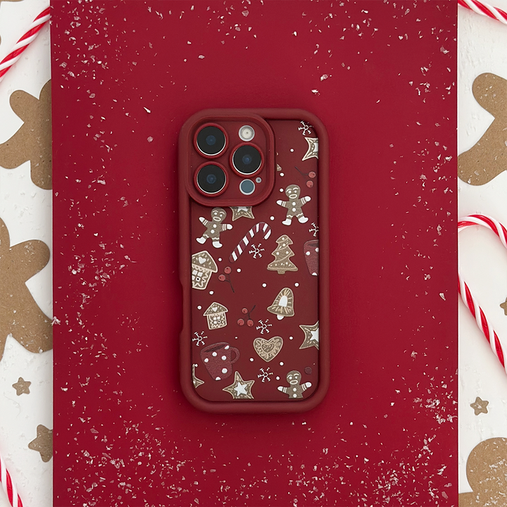 Red phone case with holiday-themed gingerbread design on a wooden surface.
