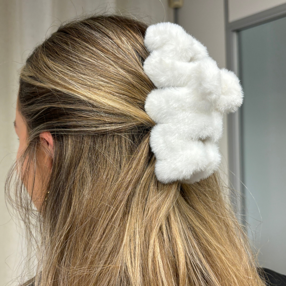 Add a touch of cosy chic to your hair game with the White Squiggle Faux Fur Claw Clip.