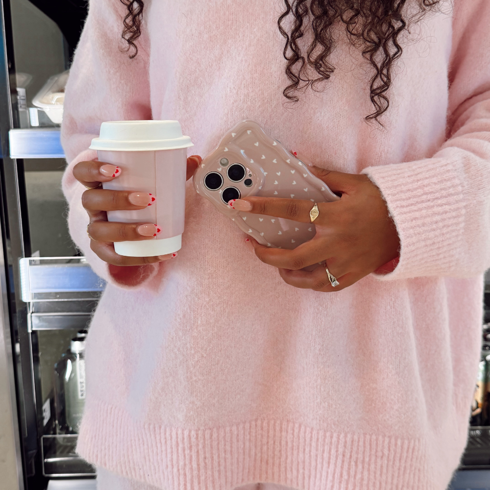 Featuring a warm brown background sprinkled with crisp white hearts, this case is the perfect blend of sweet and stylish. The playful wavy edges add a trendy twist while making your phone easy to grip.