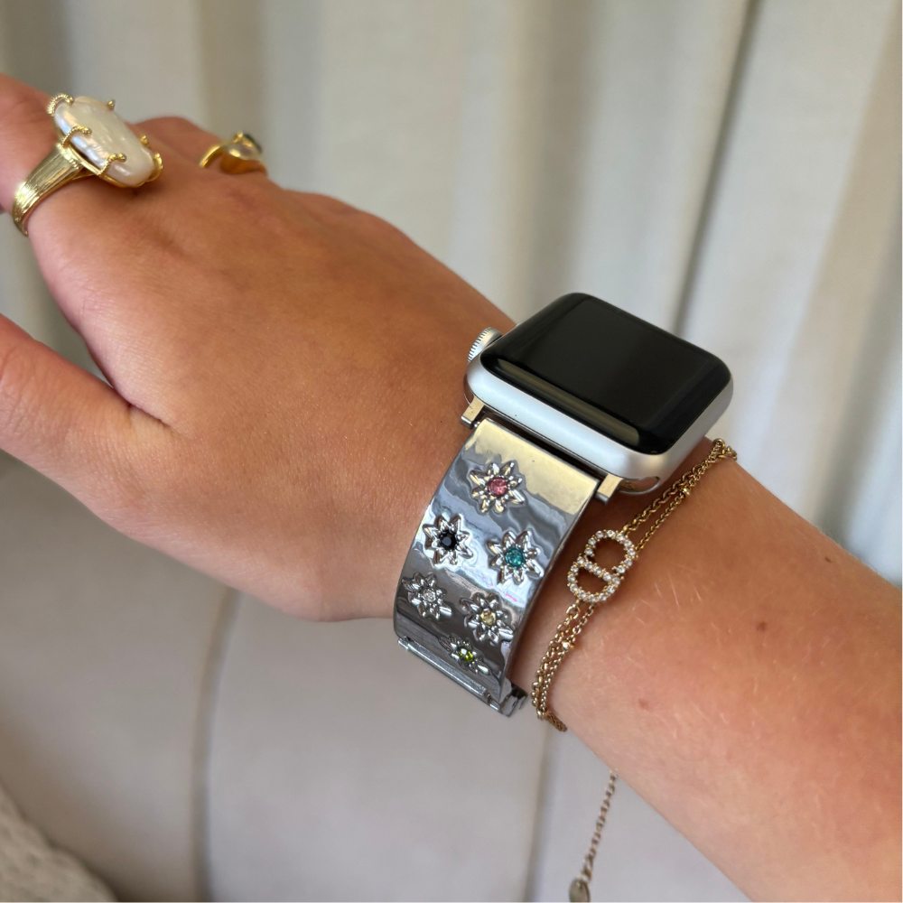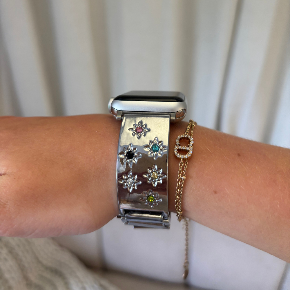 Bring some dreamy, sun-kissed sparkle to your wrist with our Ibiza Coloured Stone Apple Watch Strap in Silver. Designed for the girls who love their accessories sweet, stylish, and just a little bit magical, this strap is dotted with delicate coloured stones that shimmer like a summer sunset on the beach. 💫🌸